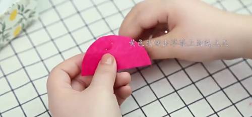 14红色不织布上画出直径6cm的半圆,黄色线缝出草莓上面的点点。