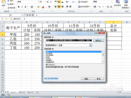 选择单元格j3,点击插入函数fx调出插入函数对话框窗口。