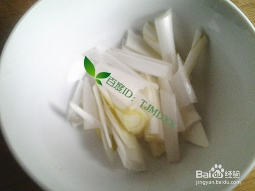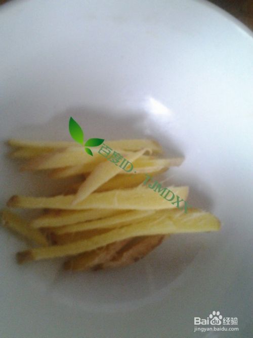 新鲜的生姜切成如下的细条,放到小碗里备用。