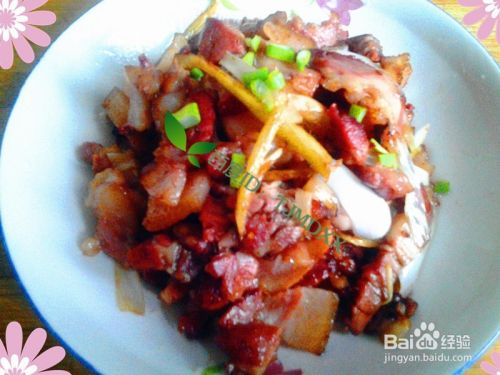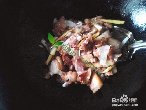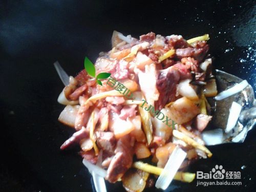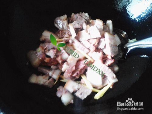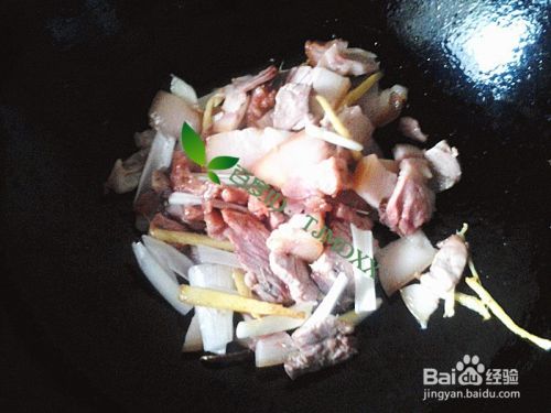 加入前面切好的猪头肉薄片,一起爆炒2分钟。