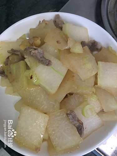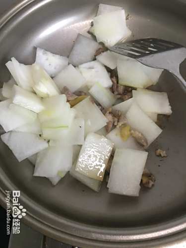 起锅烧油,下入生姜与肉丝煸香,肉变色后下入冬瓜翻炒。加盐加料酒继续翻炒,加盖煮2分钟。
