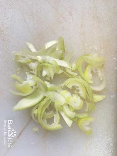 将冬瓜去皮洗净,切片备用。生姜切片、肉切丝备用。大葱切细丝备用。