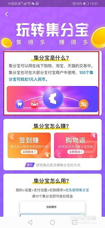 第一步我们首先需要知道的是支付宝集分宝相当于一种积分奖励,可以直接在淘宝,线下购物的时候使用,100集分宝等于1元,如下图所示:
