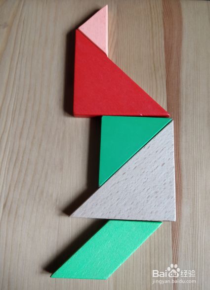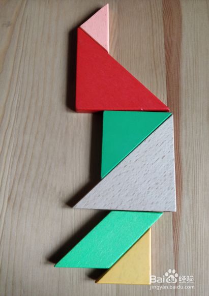 将粉色三角形斜边竖直居于右侧,放在红色三角形的上面挨着,直角顶点挨着红色上顶点。