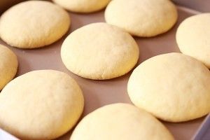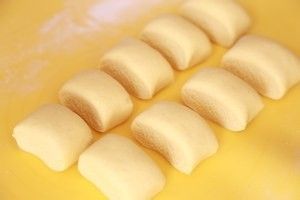 5面团发酵好后,在面板上撒一些干面粉,然后将面团移到面板上,搓揉2-3分钟左右,排除面团里面的空气,接着将面团搓成长条状,用切刀均匀的切成重约50g的小面团。