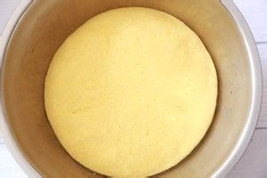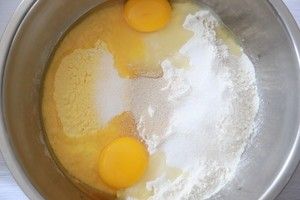 1准备一个稍微大一点的和面盆,将玉米面、面粉、鸡蛋、白砂糖、干酵母和牛奶全部倒入盆内。
