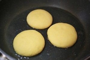 9预热平底锅,刷上一层油,放上玉米面饼烙至表面呈金黄色。