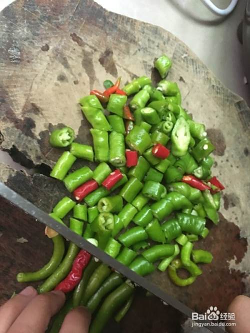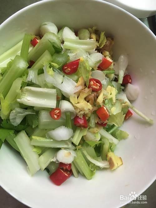 依次放入干辣椒、花椒、姜块,放入2羹匙豆瓣酱,熬几十秒。然后再倒入芹菜、青椒段。