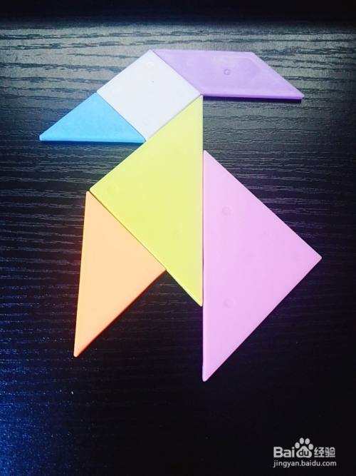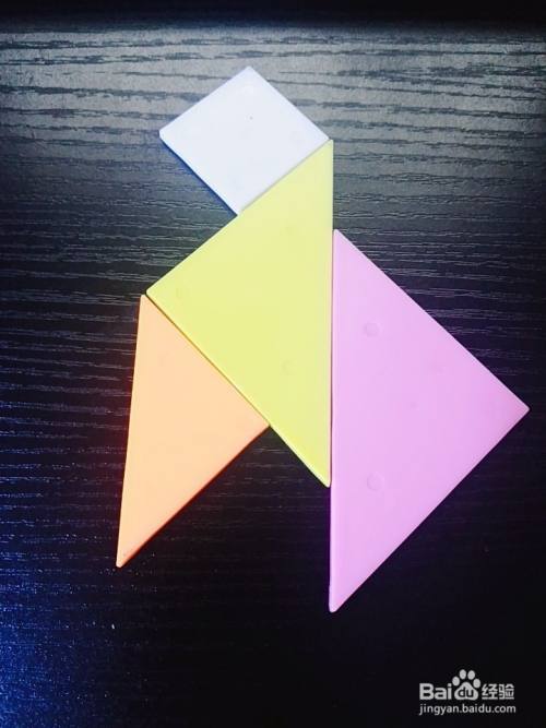 拿出一个白色正方形板放在黄色大号三角形板的上面,如图所示。