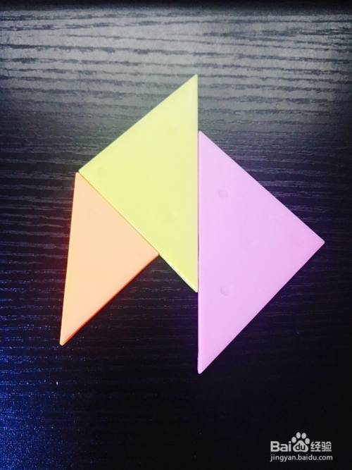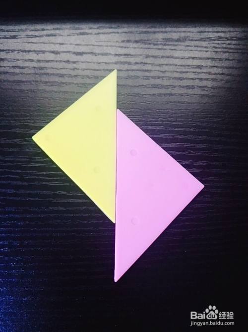 拿出一个粉色大号三角形板放在黄色大号三角形板的右边,如图所示。