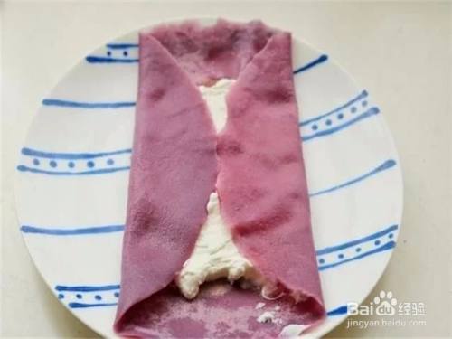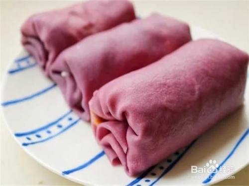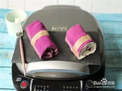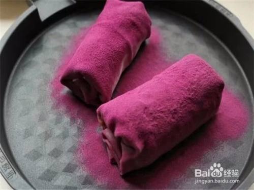 把所有的皮都卷起来,撒一些紫薯粉,毛巾卷就做好了