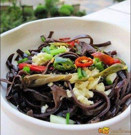 白背木耳,顾名思义,它正面是黑色,背面是白色。我的白背木耳丝是在超市买的,就这样子的。大家注意看,它背面使一些白色茸毛,所以也叫白背毛木耳。