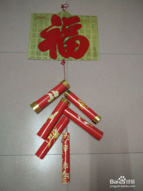 在福字地下打个小洞再把红绳子穿进去,在福字后面和最后一个炮筒小东江后面打蝴蝶结固定住。看!一个美丽动人的鞭炮福就做成了。象征春到福到,新年新气象。既有意义,又有趣,又好看,还可以挂起来收藏哦。