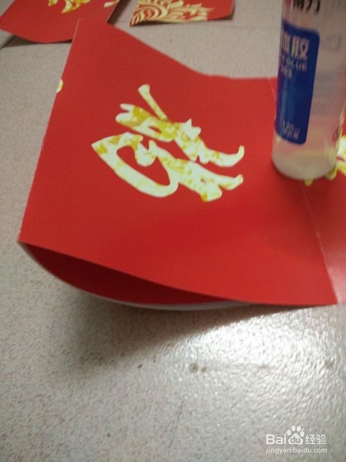 把广告春联或红纸剪成的长方形纸块卷成卷筒,用胶水或双面胶把长方形卷筒粘好。把金黄镶边粘好。