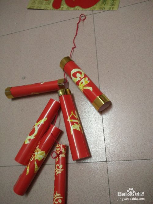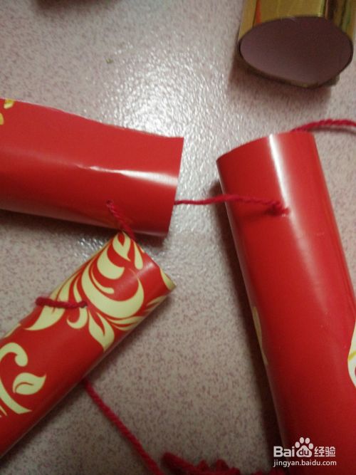 用红绳带把各个红炮筒通过之前小洞和炮筒一个个分别穿起来,摆到绳子的两边。