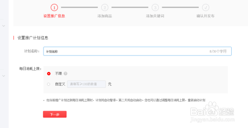 选择新建推广计划,设置推广金额,最低是100元。大家在选择的时候要多多注意,选择适合自己的金额来定。(这钱烧的也是很厉害的)