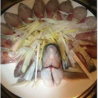 在鱼上铺上一层葱姜丝。冷水上锅,隔水蒸,上汽后蒸6分钟关火焖2分钟就好了。