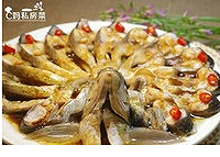 切好的武昌鱼以孔雀开屏的形式摆在盘子上,中间放上鱼头。尾巴太短开屏影响美观可以切掉一部分。