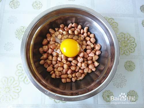 洗干净的花生米可以用厨房纸吸吸水,尽量干一点,不过有点水也无妨,打入一个鸡蛋,我用的鸡蛋不大,大约有45克