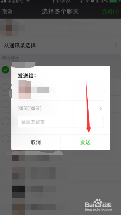 点击右上角的确定,会选择一个框框,可以在上面给朋友留言,确认无误之后点击发送。