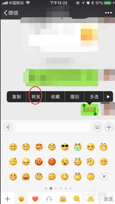 长按该条信息两到三秒,出现功能框的时候,我们选择转发。