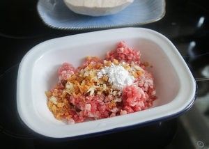 腌肉。虾米剁碎,蒜切末,加入1汤匙生抽、半茶匙糖、1茶匙生粉,一点现磨黑胡椒。搅拌均匀;