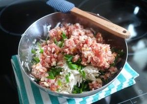 备一大碗,把腌好的肉沫放入芋丝中,加3汤匙中筋面粉、半茶匙盐、葱末,搅拌均匀,稍微加一点水没那么干,比较容易搅拌。放面粉是为了更容易黏着成饼,用粘米粉代替面粉也可以;
