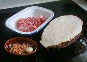 备料-猪肉碎肥瘦按自己的喜好,我一般选瘦7肥3的配比;芋头去皮去头尾;虾米泡10分钟,水留用;