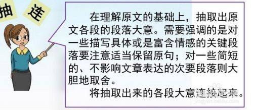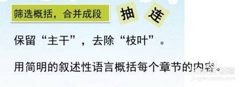 选择像《西游记》这样的章回体小说,可以多读几遍,把握住原文的主要内容。在读的过程中,可以做一做表格式的读书笔记,将主要人物、主要内容、印象深刻的情节记录下来,做到心中有数。在理解原文的基础上,抽取出原文各段的段落大意。对一些描写具体或是富含情感的关键段落要注意适当保留原句;对一些简短的、不影响文章表达的次要段落则大胆地舍去。