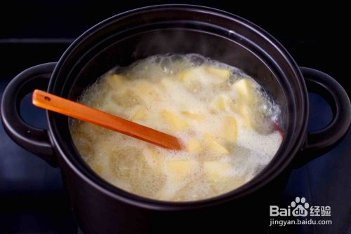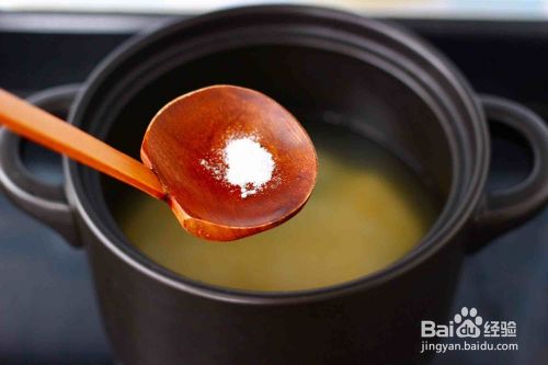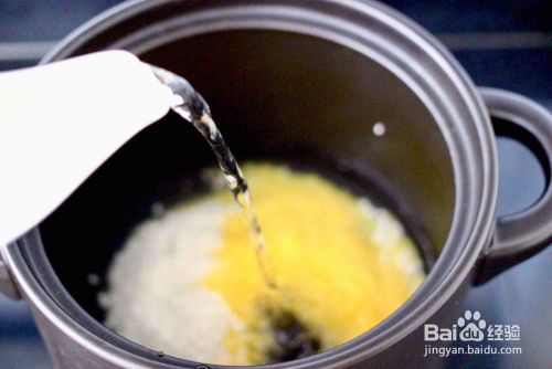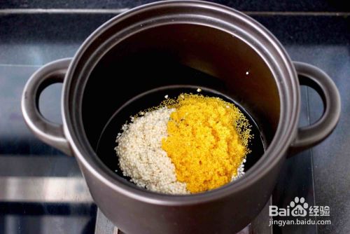 把洗净浸泡好的小米和糯米,倒入砂锅里。