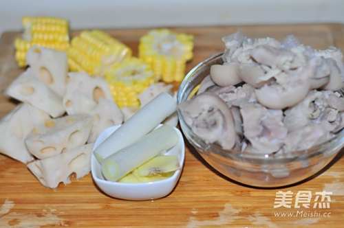 1准备材料。猪蹄剁成块,放入开水里煮至断生后洗净血末,备用。玉米切段,莲藕去皮切滚刀块。芸豆泡一夜直至涨发。