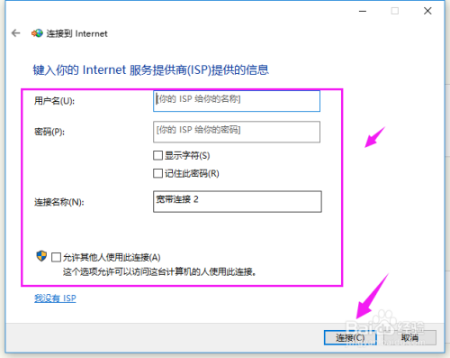 点【宽带】后输入【宽带账号+密码+名称+是否允许他人连接】,点【连接】即可,如图。