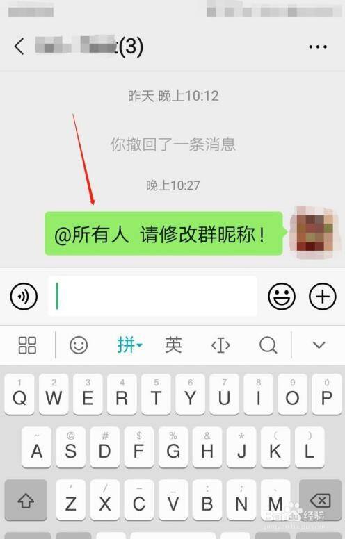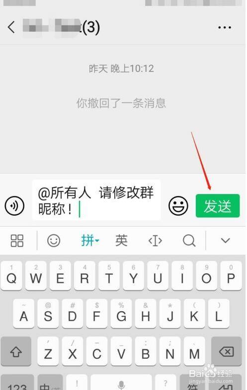 点击进入聊天页面,输入“@所有人”和通知内容,然后点击发送。