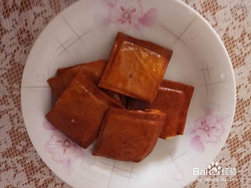 将豆腐块切成方块,然后放在油锅中先进行炸制,豆腐两面都炸制成金黄为止,然后捞出空油,将花椒、八角、盐、酱油、茶叶放在煮锅中煮成卤料,再将炸好的豆腐放在卤料中,半天后即可食用。