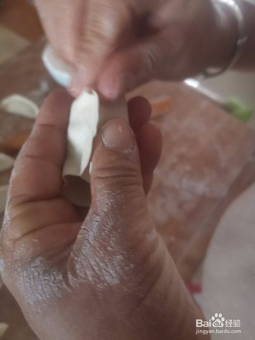 将面剂子擀成面饼,然后让如搅拌好的馅料,将饺子皮捏合成饺子