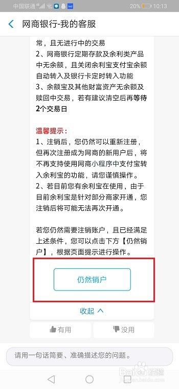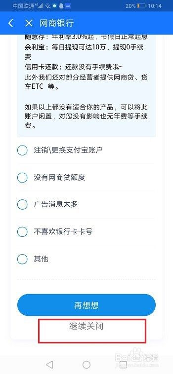 第五步进去之后,选择注销网商银行的原因,点击继续关闭,满足条件之后,就成功注销网商银行了,如下图所示: