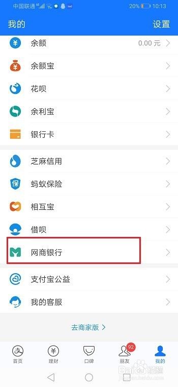 第一步手机上打开支付宝,进去我的界面,点击网商银行,如下图所示: