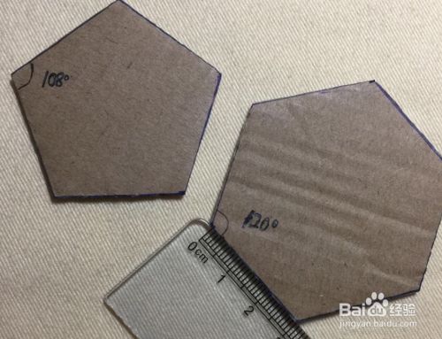 准备半圆仪,直尺,画1个边长为3cm的正五边形模版(内角:108度)、再画1个边长为3cm的正六边形模版(内角:120度),瓦楞纸,卡纸都可以