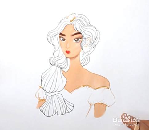 接着画出茉莉公主的身体,她穿着一字肩的衣服,非常的美丽,画出她的美丽的大眼睛。