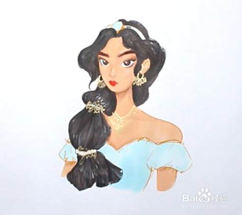 最后给她的头发涂上给色,耳环和项链涂上金色,衣服涂上蓝色,美丽的茉莉公主简笔画就完成啦!