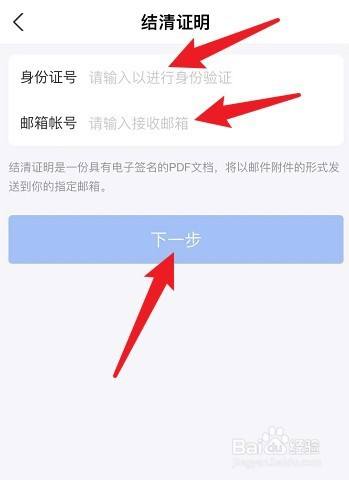 再输入身份证号和邮箱帐号,点击下一步就可以获取结清证明。