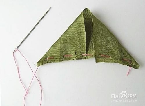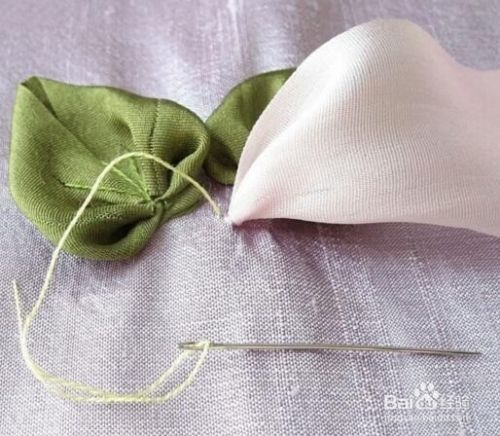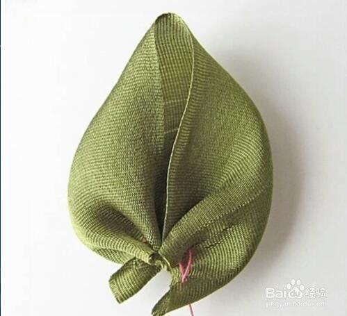 取出针线并穿好,在固定针的位置缝合,缝完之后拉紧线,并固定线在剪断,一共要做两个叶子。按同样的步骤,在做一个出来。