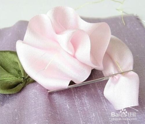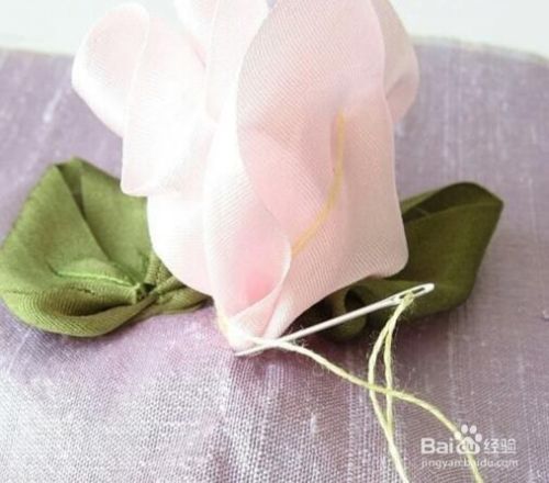 缝好了叶子,就开始缝合花朵了。取出一根大孔针,在把缝花朵的丝带穿进去,然后缝到布料的背面去。