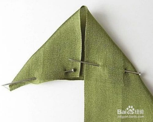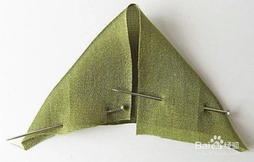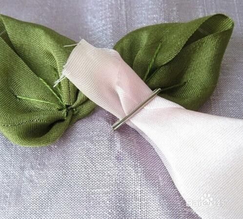 取出绿色丝带,先把衬托花朵的叶子做出来。将丝带折成三角形,然后用固定针固定形状,在用剪刀剪掉多余的丝带。