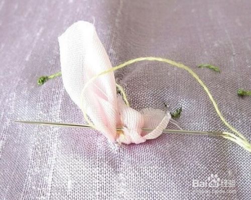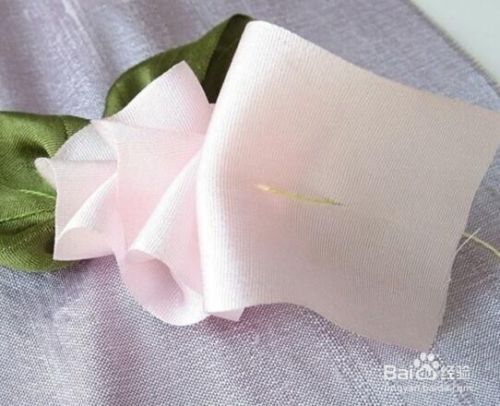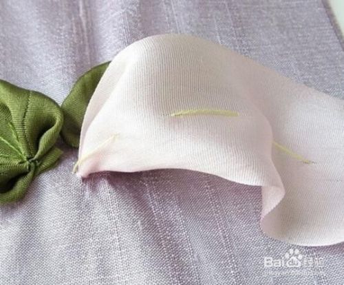这时取出穿好线的针,从布料的背面缝到前面,和丝带正对的位置,再从丝带中间开始缝,缝到需要的位置。(花朵大小取决于丝带长短)