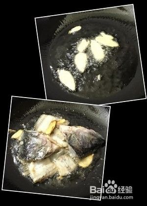 热油下姜片爆锅后放入鱼头和鱼骨煎至两面金黄;