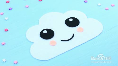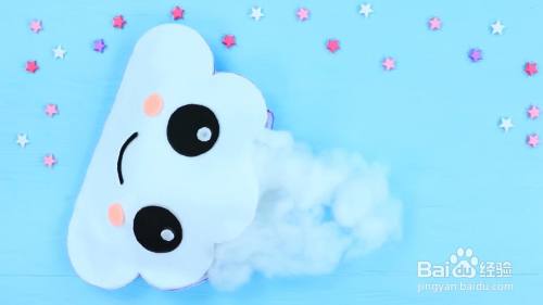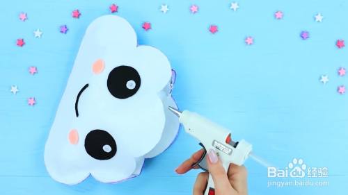 用热胶把泡沫片笑脸粘在一朵云上。