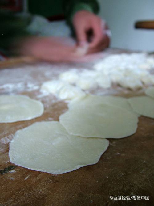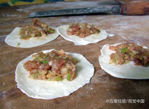 将面剂子擀成面皮,然后将饺子馅放在面饼上