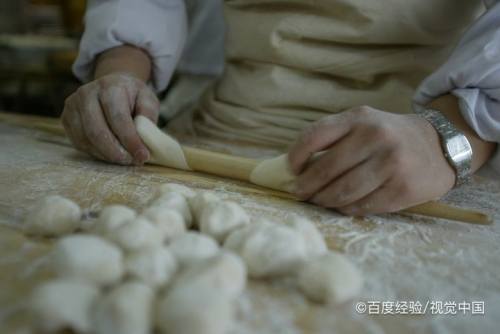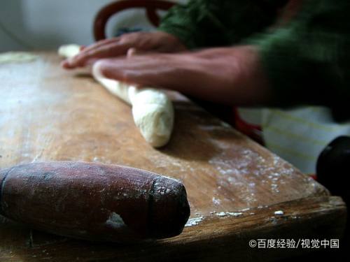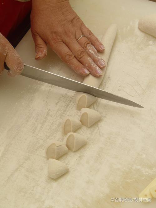 醒发好后,将面粉切成两块,然后选择一块,揉成长形粗面条,然后用刀将面条切成1指宽的面剂子