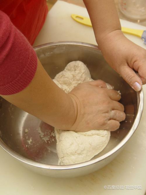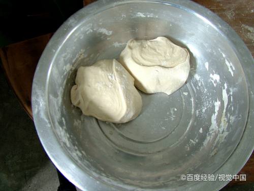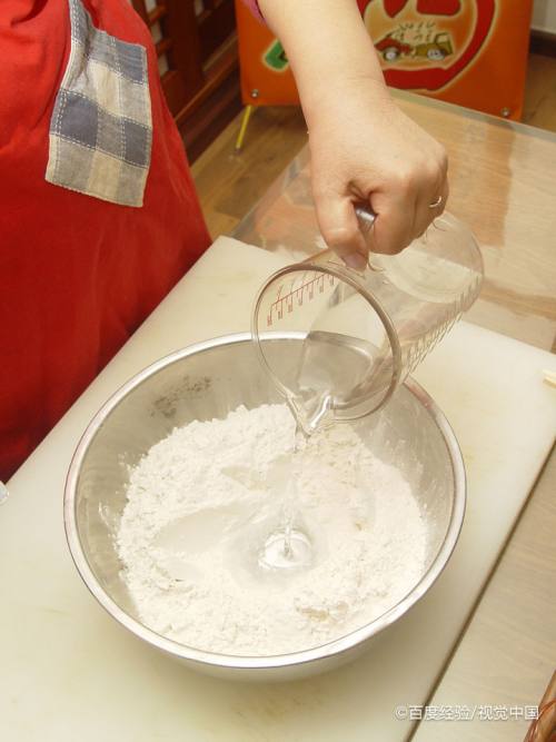 准备好饺子粉300g 放入面盆中,在用量杯里面放入140g清水,水中加入盐3g 搅拌均匀后,将面粉揉成面团,醒发30分钟